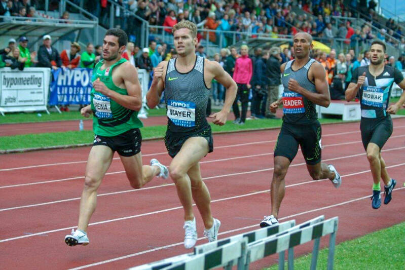 Links Kevin Mayer met achter hem Damian Warner tijdens een tienkamp in Götzis