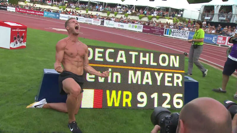 Natuurlijk kijken we allereerst naar de Fransman Kevin Mayer die in 2018 bij de Decastar Challenge in Talence het wereldrecord van de Amerikaan Ashton Eaton (9045 punten uit 2015) uit de boeken liep, wierp en sprong en met 81 punten opkrikte naar 9126 punten. Het leek er in dat weekend van 15 en 16 september 2018 sterk op dat Mayers onverzettelijke drive in Talence voortkwam uit revanche voor zijn mislukte EK dat een maand eerder in Berlijn plaatsvond. Tijdens dit EK staakte Mayer, die toen in bloedvorm verkeerde, al na het verspringen met 3 foutsprongen achter zijn naam de strijd. Als we naar de reeks prestaties kijken die de lichte en zeer getalenteerde Fransman een maand later in het Zuid-Franse Talence neerzette, dan roept dat alleen maar grote bewondering op. Wat vooral opviel was zijn sterke optreden op de werpnummers en eigenlijk zag je geen enkele zwakke plek, op zijn 1500 meter na, zoals te zien is in de door hem neergezette reeks prestaties.