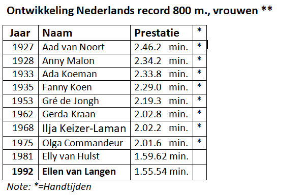 Pas in 1968 verbeterde Ilja Keizer-Laman (AV Suomi) dat nationale record en bracht het op 2.02.2 min.* Weer zeven jaar later, in 1975, was het de pas 17-jarige Olga Commandeur (AV Suomi), die met haar prachtig gelopen tijd van 2.01.6 min.* in Aalst, zowel het nationale jeugd-, senioren- en wereldjeugdrecord verder aanscherpte. In 1981 slaagde Elly van Hulst (Olympia ’48) er met een tijd van 1.59.62 min. als éérste Nederlandse vrouw in om de 800 meter binnen de twee minuten af te leggen. Het duurde uiteindelijk weer 9 jaar voordat de toen 24-jarige Ellen van Langen via 1.57.57 min. (1990) en 1.56.66 min. (1992) een nieuwe standaard zette. En als klap op de vuurpijl greep ze nog datzelfde jaar in Barcelona zo verrassend het olympisch goud in de zeer scherpe Nederlandse recordtijd van 1.55.54 min., waarmee ze nu al 33 jaar in de recordboeken staat!