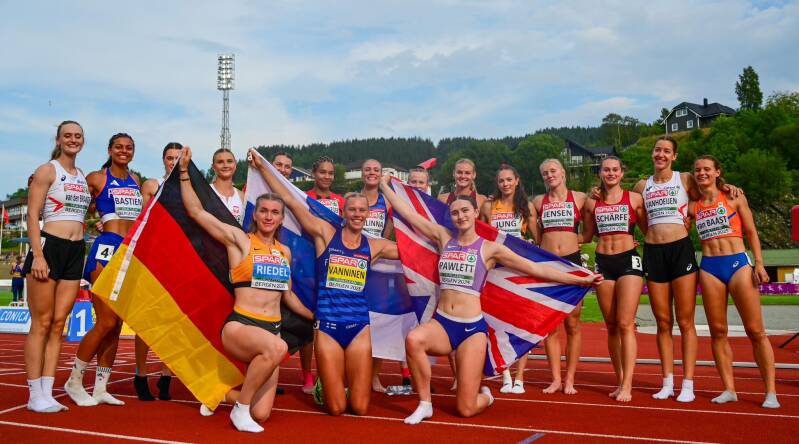De laatste meters op de afsluitende 800 meter van Saga Vanninen. De Europese titel U23 is binnen, met een nieuw Europees- U23 en nationaal record als bijvangst.