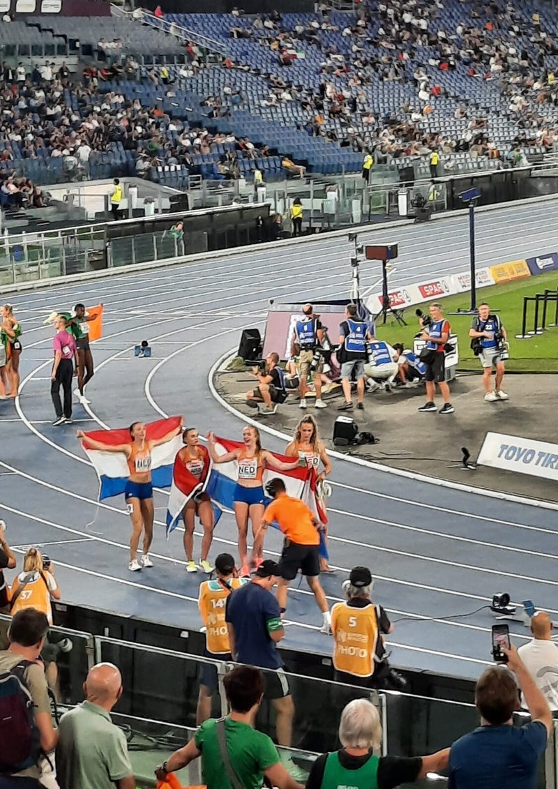 Bij de vrouwen zijn de VS natuurlijk superieur. Maar Nederland (Saalberg, Klaver, De Witte en Bol) wordt mooi derde achter Jamaica.