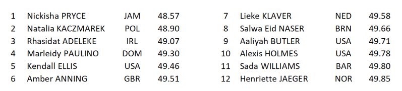 Van de top-8, wisten Nickisha Pryce, Kendall Ellis en Lieke Klaver zich niet voor de finale te plaatsen. Dat de ranglijst aanvoerster Pryce de finale niet haalde was opzienbarend, zeker ook omdat ze in de Diamond League wedstrijd in Londen een paar weken eerder had getoond in grote vorm te zijn door in 48.57 te winnen. Kendall Ellis had al getoond niet in haar beste vorm te zijn. Na het winnen van de Amerikaanse olympische kwalificatiewedstrijd in 49.46, liep ze op 12 juli in Monaco een tijd van slechts 50.39.