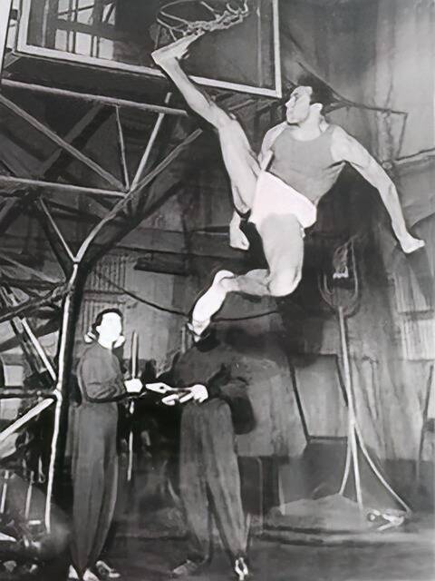 Valery Brumel, de fameuze Sovjet-Russische atleet die in 1963 met de straddletechniek tot een respectabele hoogte van 2.28 m. wist te komen. Op de foto toont hij zijn enorme sprongkracht en souplesse door met zijn zwaaibeen de 3.20 m. hoge basketbalring te toucheren.
